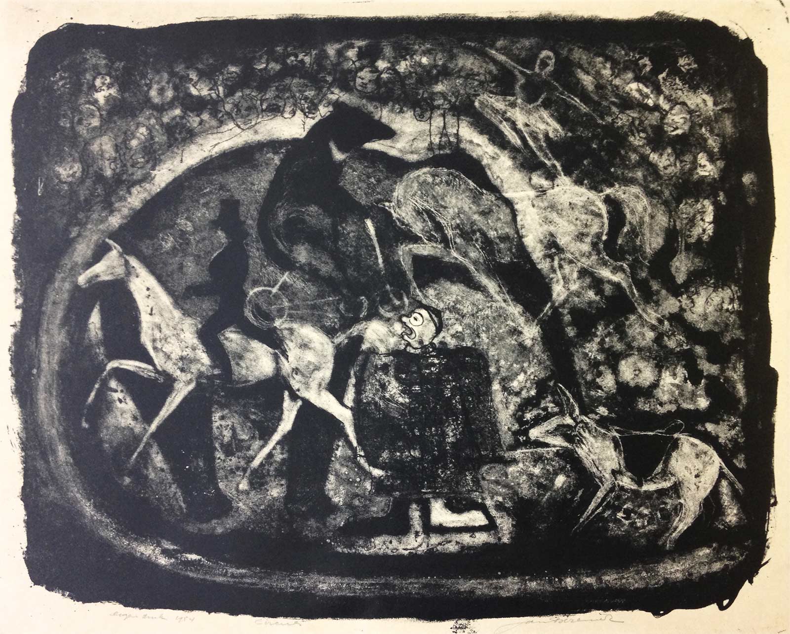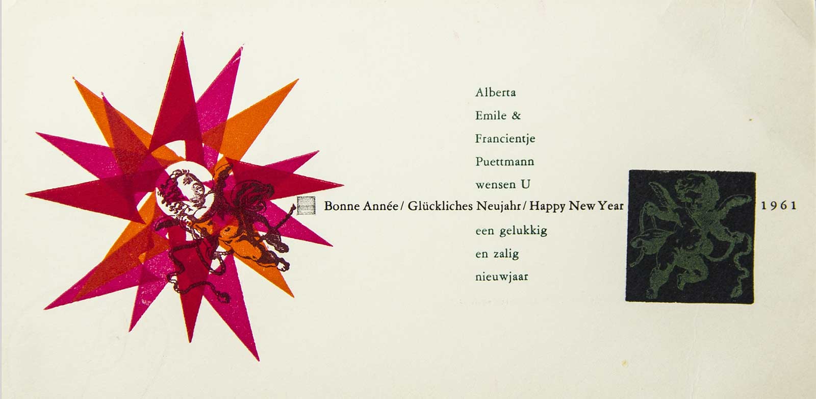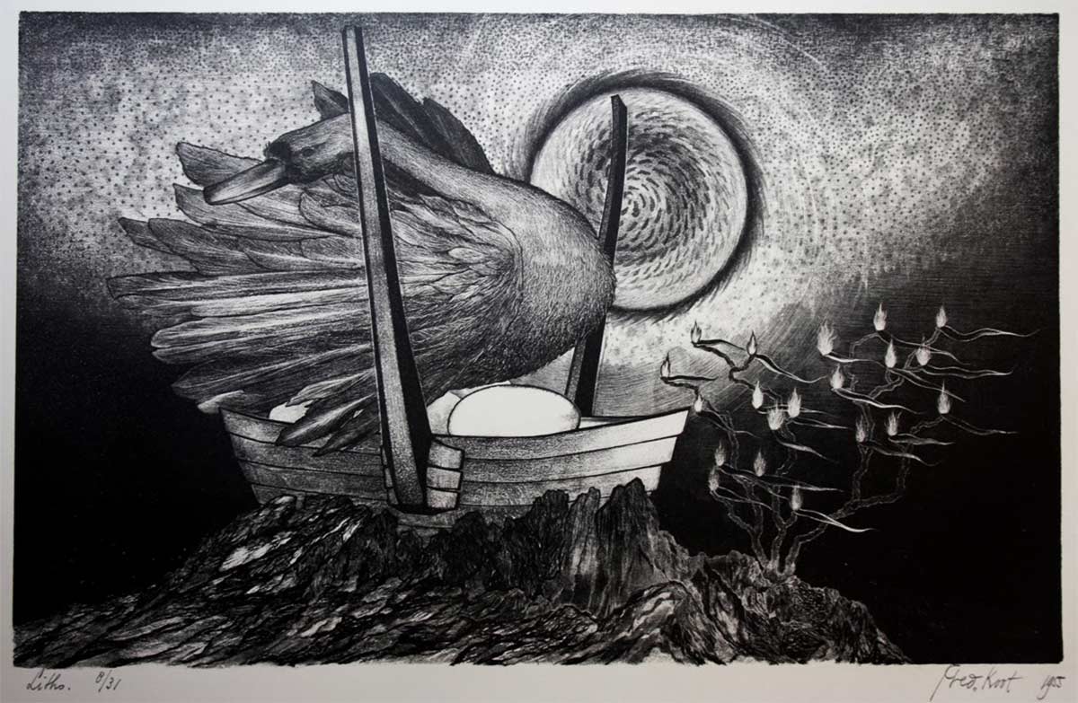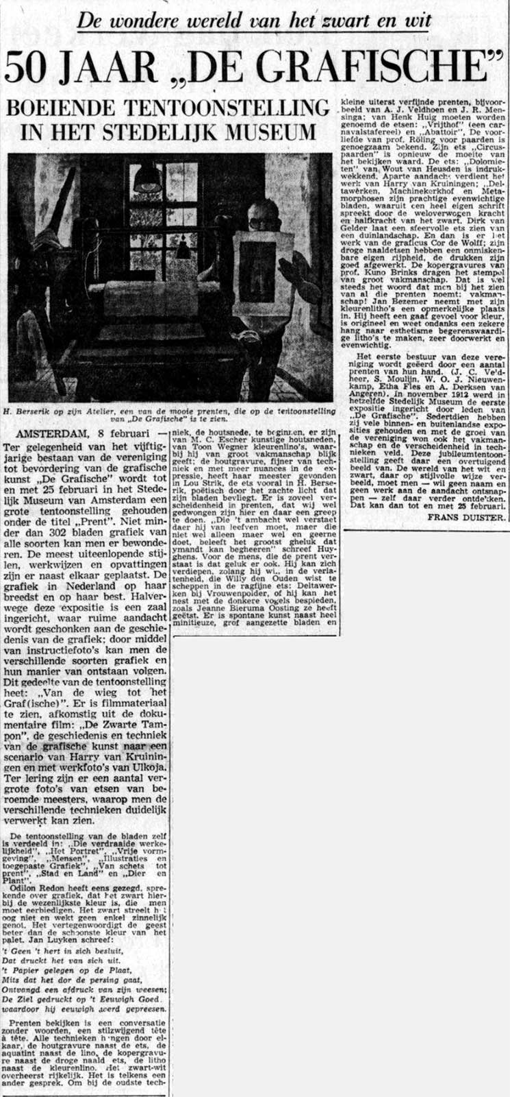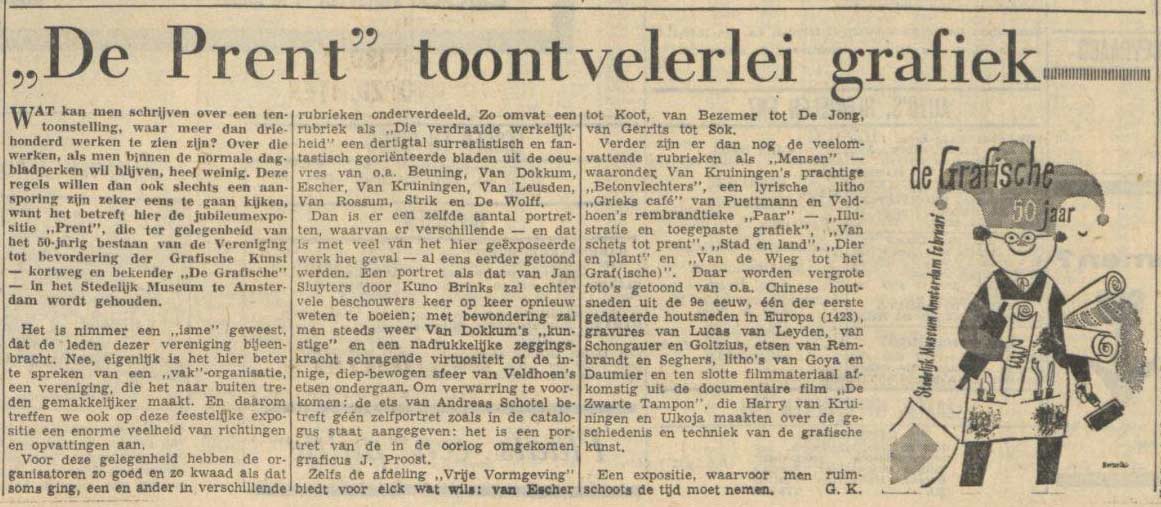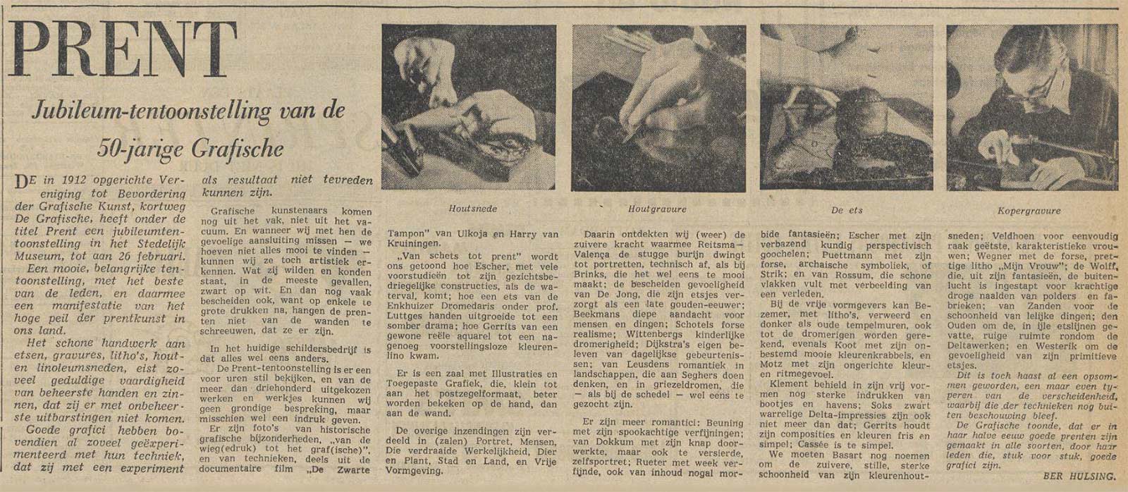 Ter gelegenheid van het vijftigjarige bestaan van de vereniging tot bevordering van de grafische kunst ‘De Grafische‘ werd in februari 1962 in het Stedelijk Museum een grote tentoonstelling gehouden. Escher was er natuurlijk bij, net als zijn vriend Gerd Arntz en vele andere grafische collega’s. Het was bepaald niet voor het eerst dat de grafici in groepsverband en onder de naam van hun vereniging samen exposeerden, maar voor de jubileumtentoonstelling werd echt groot uitgepakt. Onder de titel Prent waren er in het Stedelijk meer dan 300 werken te zien. Grafiek van alle soorten en in de meest uiteenlopende stijlen, werkwijzen en opvattingen. Er was een aparte zaal ingericht waarin aandacht werd geschonken aan de geschiedenis van de grafiek en met uitleg over de grafische technieken. Ook was de documentaire De Zwarte Tampon, van graficus (in dit geval ook scenarist en regisseur) Harry van Kruiningen en fotograaf (hier deed hij camera en montage) Ulkoja, voor het eerst te zien.