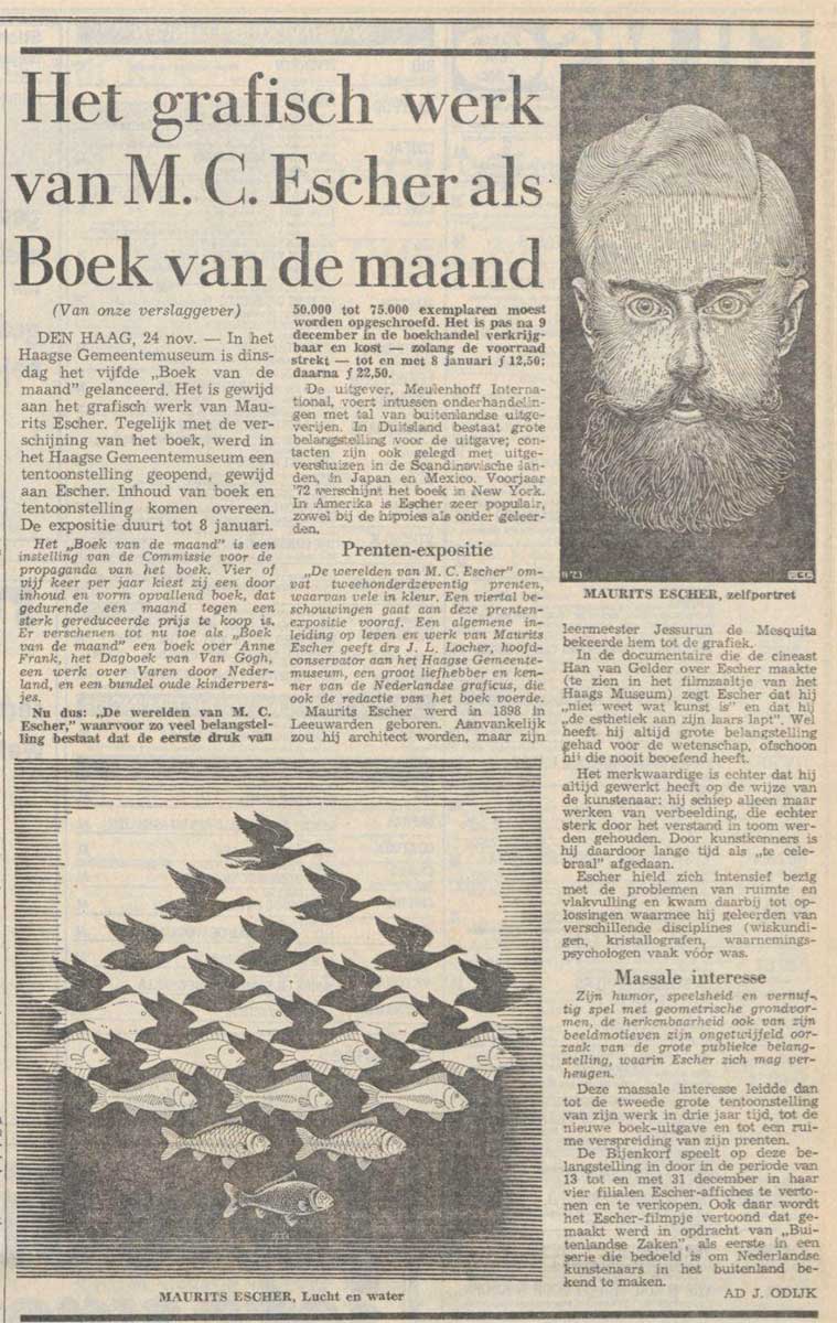 Direct na de publicatie organiseerde het Gemeentemuseum een tweede grote tentoonstelling, met alle prenten die in het boek waren opgenomen. Ook hier kwamen weer tienduizenden bezoekers op af. De Bijenkorf vertoonde in haar vier filialen 18 reproducties van Escher en verkocht ze voor prijzen tussen de vijf en negen gulden. Ook was er een Bijenkorf poster met daarop een afbeelding van Lucht en Water I. Bezoekers konden in de filialen kijken naar Adventures in Perception (de Nederlandse titel was Met het oog op avontuur), de film over Escher die door regisseur Han van Gelder was gemaakt in opdracht van het Ministerie van Buitenlandse Zaken. De film werd ook op tv vertoond. Zelden werd een kunstenaar in één maand zo geëerd.‘Het blijft juist aan de kunstenaar in Escher voorbehouden dat hij erin slaagt zijn eigen gefascineerdheid, geobsedeerdheid door de verborgen wetten van de geometrie in de natuur en de laatste vragen van ruimte en tijd met beeldende middelen op ons over te brengen. Hij doet meer dan ons raadsels opgeven, dan een formule illustreren, hij creëert daarvoor ook zijn eigen beeldtaal, zijn “werelden”.’