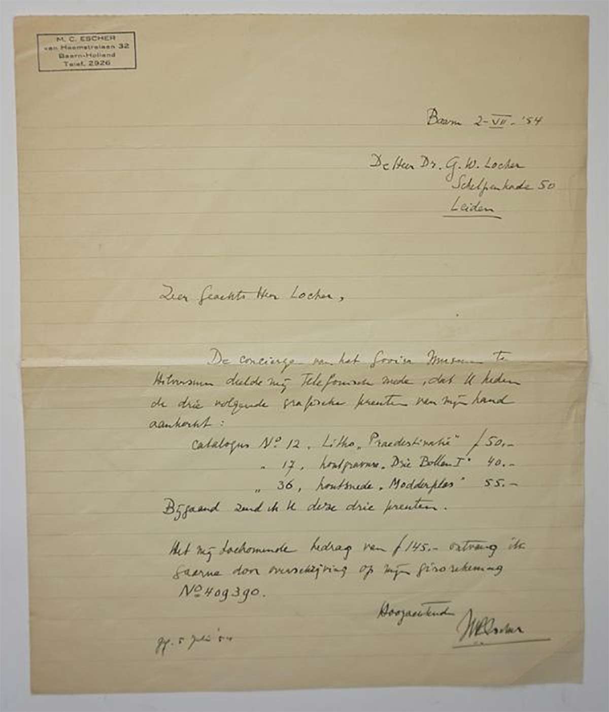 Het was een periode waarin het werk van de graficus nog betaalbaar was. Bij Catawiki is in 2015 een handgeschreven factuur van Escher aan Locher geveild, met daarin prijzen voor de litho Predestinatie, de houtgravure Drie Bollen I en de houtsnede Modderplas. Die kostten Locher respectievelijk 50, 40 en 55 gulden. Toen Escher die factuur op 2 juli 1954 schreef, had hij nog geen idee hoeveel meer zijn werk jaren later waard zou worden.