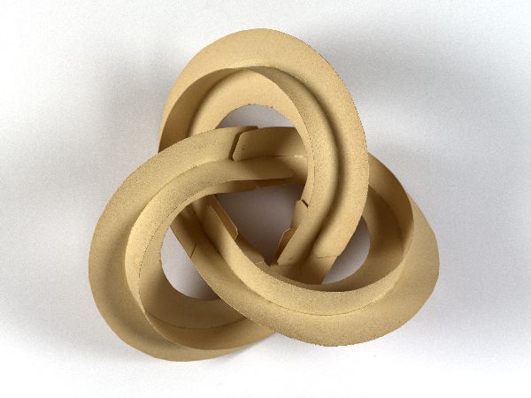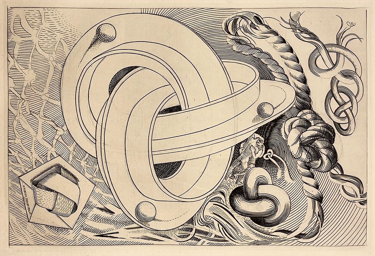 Gewoon een knoop dus, maar Escher bleef maar worstelen met een goede manier waarop hij die in een interessante, visuele vorm moest weergeven. De houtsnede Knopen toont letterlijk dit ‘leerproces’. Van rechtsboven (een dichte knoop, als een krakeling) via linksboven (een variant daarop, met een kruisvormig profiel) tot het eindresultaat (een rechthoekig hol profiel dat aan weerszijden is ingesneden zodat het op een tandwiel lijkt).