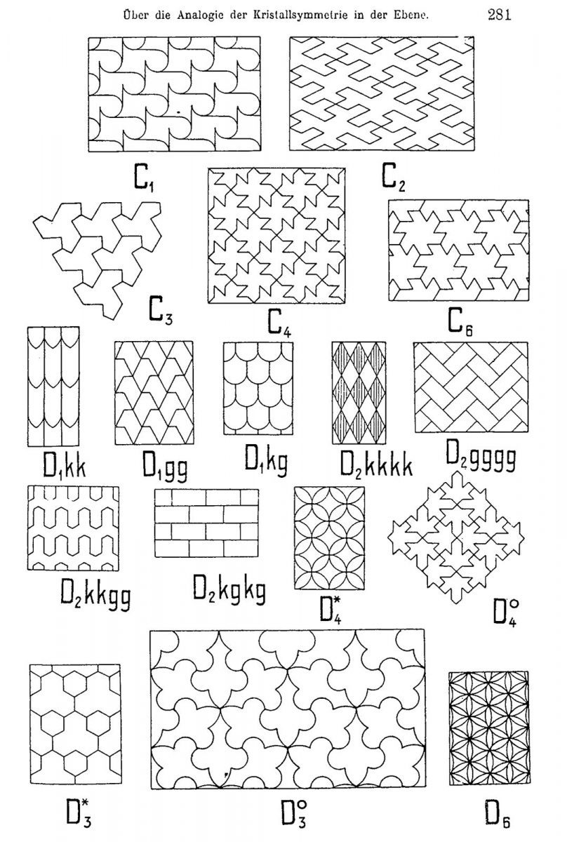 Het vaktijdschrift bleek te moeilijk en te theoretisch om hem echt te boeien, maar er was een artikel dat hem wel intrigeerde: Über die Analogie der Kristallsymmetrie in der Ebene (1924) van de Hongaarse, in Zurich wonende professor George Pólya***. Daarin definieerde Pólya 17 verschillende geometrische systemen waarmee een vlakvulling gemaakt kan worden. Het ging Escher niet zozeer om de theorieën daarachter, maar om de visuele duiding ervan. Pólya had van elk systeem namelijk een tekening gemaakt. Dat visuele bewijs fascineerde Escher mateloos en in zijn tekenschrift tekende hij de 17 systemen na. In de slotalinea van zijn artikel hintte Pólya er al op dat zijn systematische indeling van vlakvullingen niet alleen voor wiskundigen interessant was, maar dat ook zou kunnen zijn voor kunstenaars.