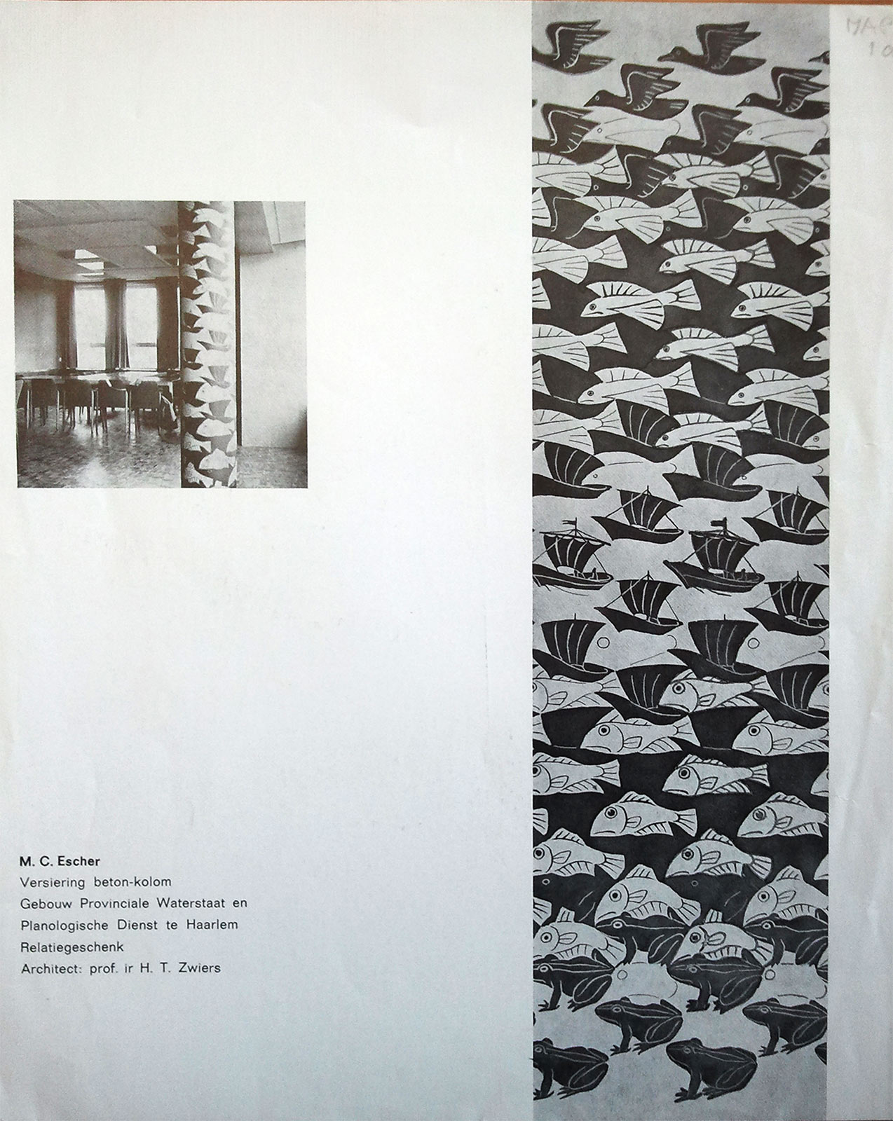 In januari 1962 maakte hij vier tekeningen waarvan hij al direct wist waar hij ze voor wilde gebruiken. Escher had namelijk een opdracht gekregen van de Verenigde Noord-Hollandse Waterschappen die een cadeau aan wilden bieden aan de Provinciale Waterstaat Noord-Holland. Ze vroegen hem om een ontwerp te maken voor een betonnen zuil in het nieuwe hoofdkantoor aan de Zijlweg in Haarlem. In 1959 had hij al zuilen ontworpen voor de Johanna Westermanschool in Den Haag en dat was de overheidsinstantie waarschijnlijk opgevallen. Maar de aanpak in Haarlem verschilde wel. Voor de school werd de vlakverdeling uitgewerkt in tegels. Voor de zuil in Haarlem werd het ontwerp op het beton geschilderd.