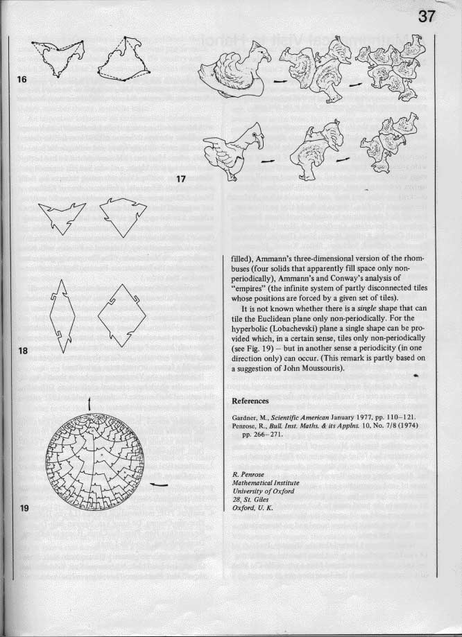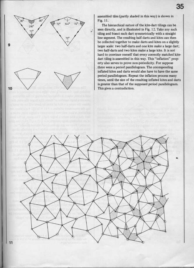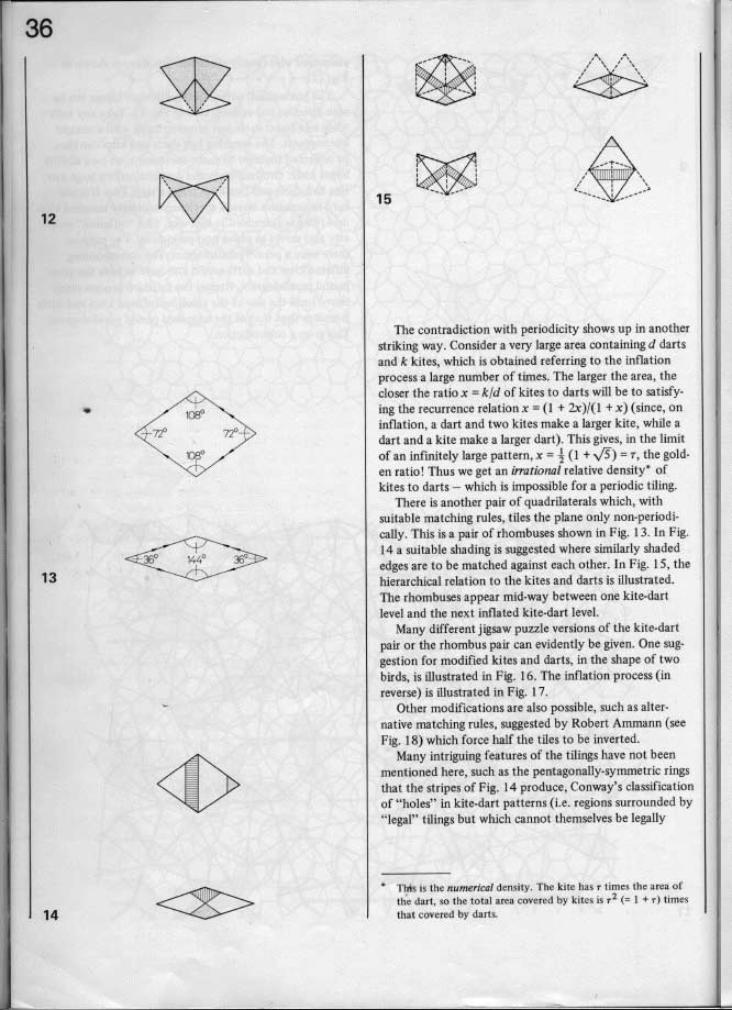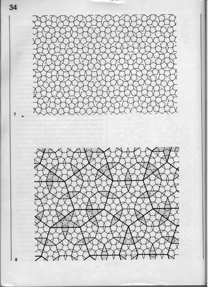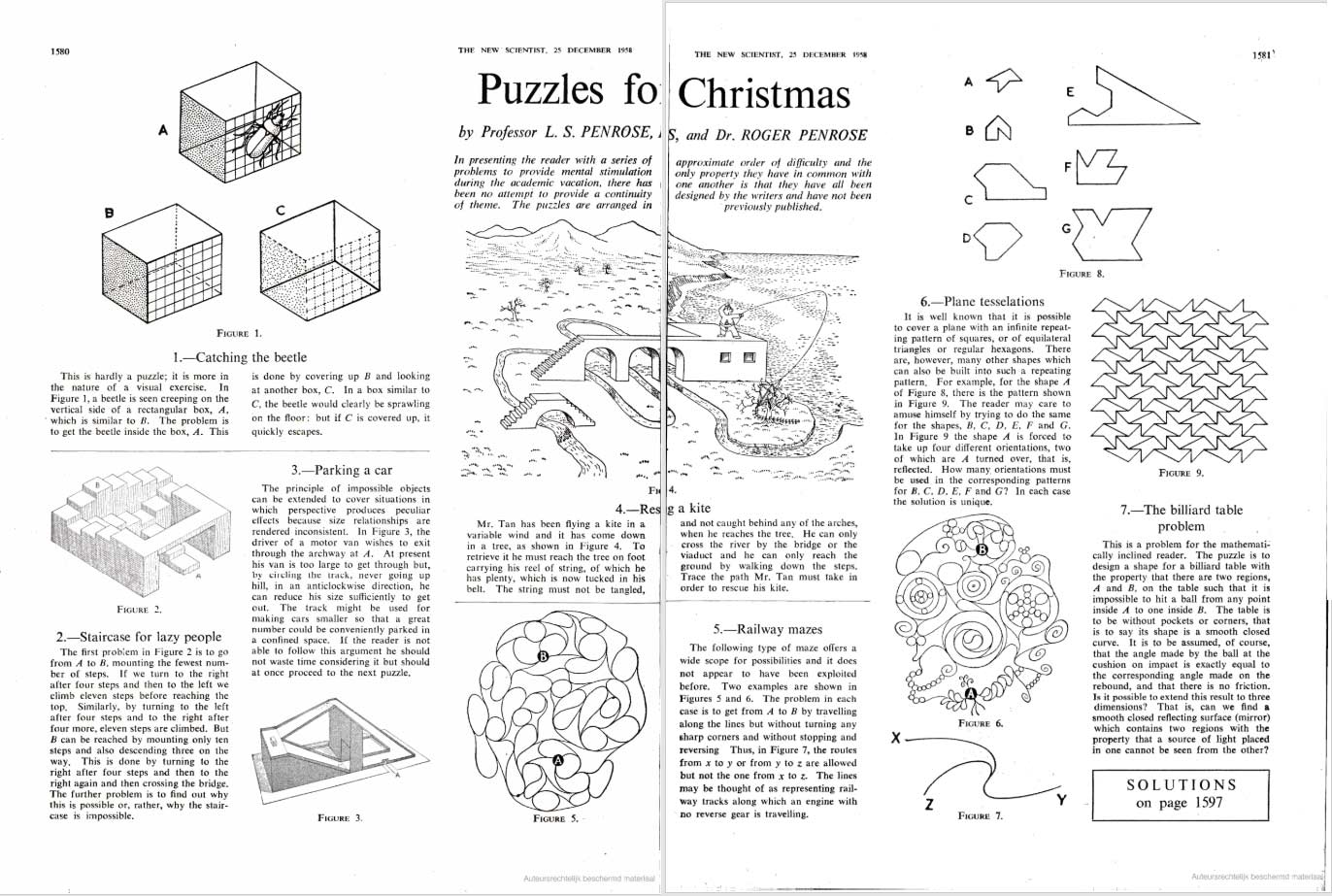 Maar langzaam rees de consensus dat er ook vlakvullingen moesten bestaan die niet willekeurig herhaald konden worden. Roger Penrose schreef er in 1958 al een artikel over voor de kersteditie van New Scientist, samen met zijn vader Lionel Penrose. Daarin lieten ze lezers puzzelen op deze a-periodieke betegelingen, op basis van zeven verschillende basisvormen.