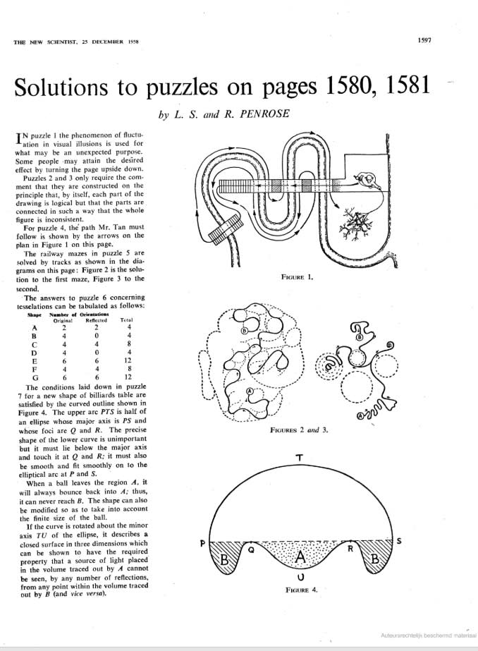 In 1962 was de Britse wiskundige Roger Penrose in Nederland en hij bezocht Escher in zijn huis in Baarn. De twee hadden elkaar leren kennen nadat Penrose werk van Escher had gezien tijdens het Internationaal Mathematisch Congres in 1954. Ze begonnen een briefwisseling die in 1960 zou leiden tot de prent Klimmen en dalen. Penrose is zijn hele carrière gefascineerd geweest door vlakvullingen, een fascinatie die hij deelde met Escher. Penrose kreeg van Escher een prent en hij gaf zijn gastheer op zijn beurt een houten puzzel. Die bestond uit een serie identieke geometrische vormen, gebaseerd op een ruit. Twee zijden van de ruit waren aangepast door er een trapeziumvorm met hoeken van 60 en 120 graden hoeken uit te snijden en die aan de andere zijden aan te leggen. De vormen pasten op veel manieren in elkaar, maar er was maar één unieke manier waarop ze zo gecombineerd konden worden dat er een vlakvulling ontstond met daarin alle puzzelstukken. De wiskundige daagde de graficus uit om de puzzel op te lossen. Escher nam de uitdaging aan en puzzelde er een tijd op. Met succes. Een aantal weken later stuurde hij Penrose een brief met daarin een schets van de oplossing. In de brief uitte Escher zijn verbazing over het feit dat de vormen maar op één manier in elkaar pasten. Het ging in tegen zijn jarenlange overtuiging dat een vlakvulling, door middel van diverse spiegelingen en draaiingen, oneindig voortgezet kon worden.