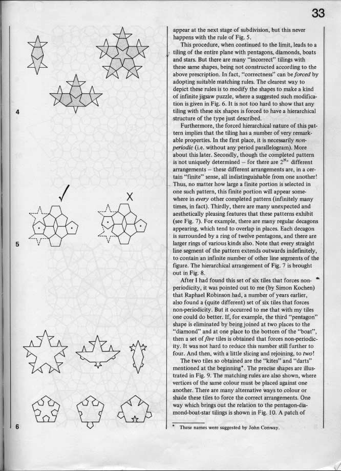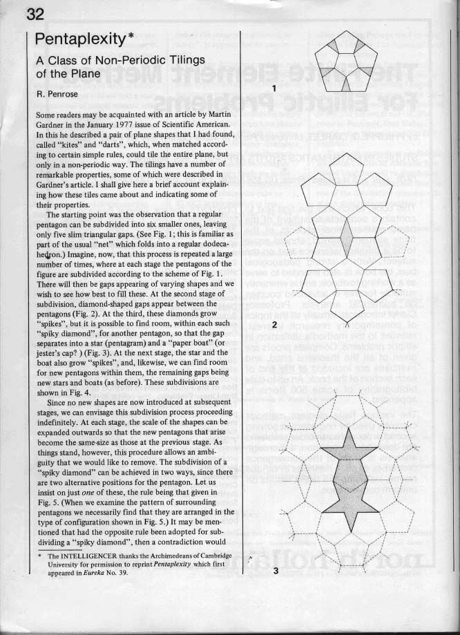 In het artikel met de titel ‘Pentaplexity‘, gepubliceerd in 1979 in het wiskundig tijdschrift Eureka, beschreef Penrose zijn zoektocht naar a-periodieke betegelingen.