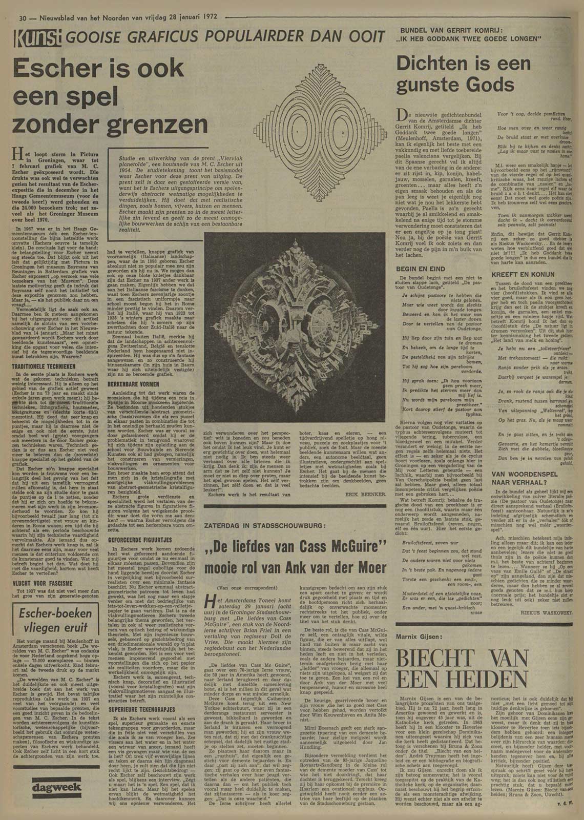 Aanvankelijk denk je dat dit een prijzend stuk wordt. De koppen zijn heel positief en de auteur begint met de constatering dat de kunstenaar bij het publiek steeds populairder wordt. De aanleiding voor het artikel is een tentoonstelling van Escher in Pictura in Groningen maar op hetzelfde moment is er ook een tentoonstelling in Boymans van Beuningen in Rotterdam. ‘Op verzoek van vele bezoekers van het Museum.’ De auteur vermoedt dat Boymans het anders nooit gedaan zou hebben. Vervolgens begint hij de kunstenaar stelselmatig af te breken, gebruikmakend van woorden als ‘weinig interessant‘, ‘traditioneel‘, ‘oubollig‘, ‘geforceerd‘, ‘gegoochel‘, ‘spelletje‘ en ‘het resultaat van boter, kaas en eieren.’