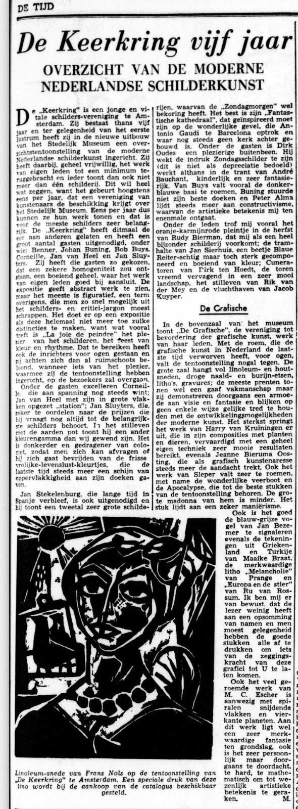 Artikel in De Tijd van 1 april 1955 waarin het werk ’te doordacht, te hard, te mathematisch’ wordt genoemd ‘om tot wezenlijke artistieke betekenis te geraken.’