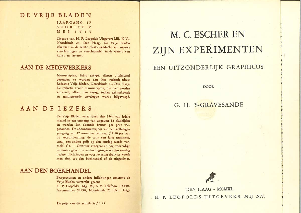 G.H. ‘s-Gravesande, M.C. Escher en zijn experimenten. Een uitzonderlijk graficus (titelblad), uitgeverij Leopold, mei 1940