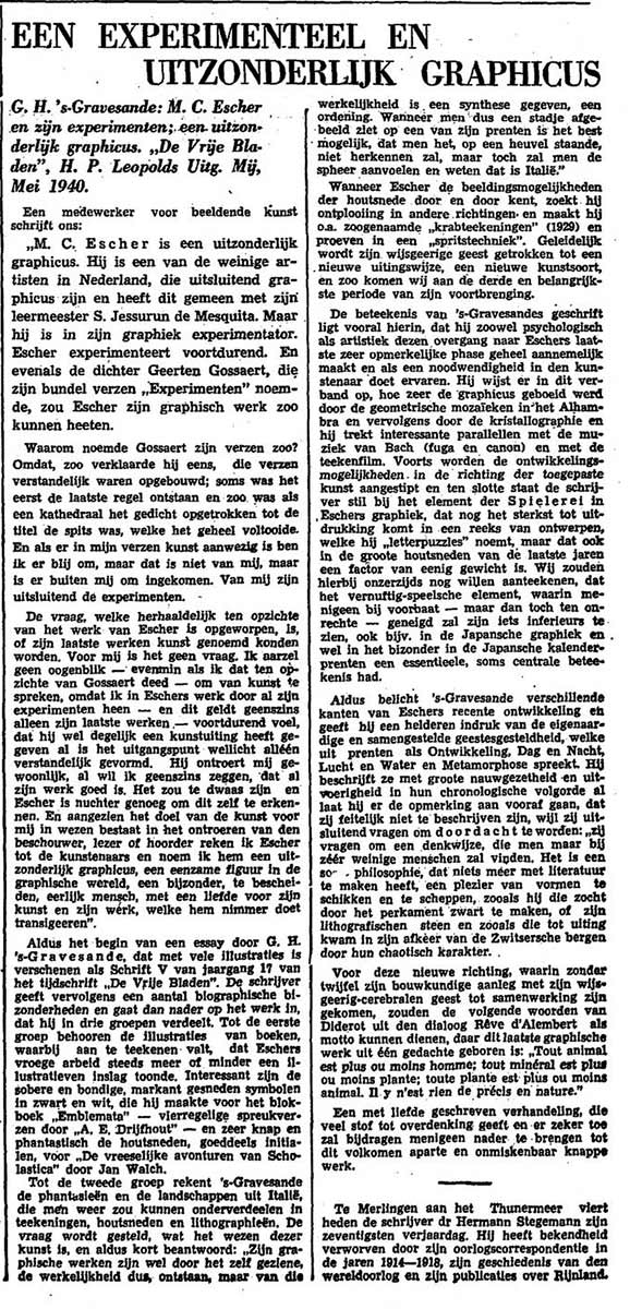 ‘s-Gravesande zag het werk van Escher voor het eerst toen de Emblemata-serie in de zomer van 1932 in boekvorm verscheen. Hij besloot om Escher op te zoeken toen die bij zijn ouders in Den Haag logeerde **. Kort daarop hield hij een lezing over grafische kunst ter gelegenheid van de opening van de kunsthandel Joh. D. Scherft aan de Laan van Meerdervoort in Den Haag ***. Escher was ook vertegenwoordigd op de openingstentoonstelling en ‘s-Gravesande sprak met bewondering over zijn werk. Een jaar later, op 28 oktober 1933, was hij weer op dezelfde plek waar hij een solotentoonstelling over Escher opende en opnieuw getuigde van zijn liefde voor diens prenten ****. Hij bleef Escher in die jaren daarna volgen. In 1938 schreef hij een artikel over Escher in Elsevier’s Maandschrift, in 1940 gevolgd door het boekje M.C. Escher en zijn experimenten. Een uitzonderlijk graficus. In die laatste publicatie gaat hij uitvoerig in op het leven en werk van Escher en hij bespreekt meerdere prenten in detail, waaronder de Emblemata-serie, Ontwikkeling I en II, Metamorphose II, Lucht en Water I en II en Kringloop. Nadat kunsthistoricus G.J. Hoogewerff in 1931 een waarderend artikel over hem schreef in Elsevier’s Maandschrift, was dit de tweede publicatie die Eschers artistieke geloofwaardigheid en zijn plek in de kunstwereld bevestigde. In zijn tekst toont ‘s-Gravesande een uitstekend inzicht in de thema’s die Escher fascineerden. Dat inzicht werd ongetwijfeld geholpen door de persoonlijke band die de twee inmiddels met elkaar hadden opgebouwd.