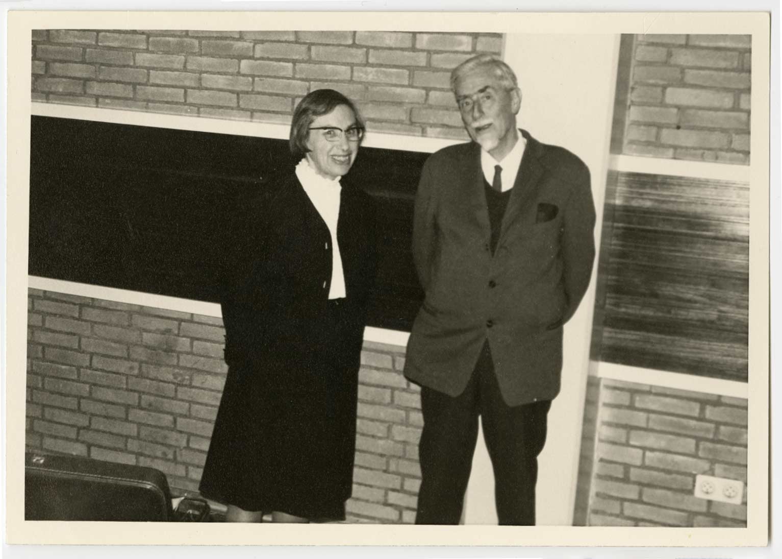 ‘Het leukste dat mij de laatste tijd overkwam was echter een bezoek gisterenmiddag, vandaar dat ik niet kon schrijven aan jullie, van een dame geheten Prof. Dr. MacGillavry, docente in de kristallografie aan de Amsterdamse Universiteit. Ze kwam met haar schoonzus, ook op een of andere wijze geïnteresseerd in vlakverdelingen, en ze hebben met z’n beiden in mijn prenten zitten neuzen van half drie tot ruim half zes. Dat waren me nog eens een paar gewiekste tantes! Het is een verademing om eindelijk eens bezoekers te ontvangen die niet, zoals meestal, verwilderd op mijn beestjes zitten te staren, maar die hoogst geamuseerd grinniken waar er te grinniken valt. J. Chr.! Wat zaten ze me te turen op sommige prentjes. Een paar maanden geleden ontving ik een Belgische-Amerikaanse collega van haar, ene professor Donnay, die ergens in de US doceert en die schijnt mevrouw MacG. op mijn spoor gebracht te hebben. Ze wou blijkbaar eerst wel eens weten wat voor vlees ze in de kuip kreeg, voor zich met mij te compromitteren. Nu dat blijkbaar meeviel zal ze moeite doen om mij een voordracht te laten houden in augustus 1960 in Cambridge, waar een stuk of 700 kristallografen dan een congres houden. Daar sprak die Donnay trouwens ook al over en nu ziet het er naar uit dat het wel door zou gaan. Daar komt dan ook een tentoonstelling van mijn prenten aan te pas en de reis- en verblijfskosten worden mij vergoed. Jullie snappen, dat een dergelijk buitenkansje niet aan mijn neus moet voorbij gaan; dus als moeder en ik naar Canada komen zal het wel september 1960 worden, maar dat lijkt mij geen bezwaar.’