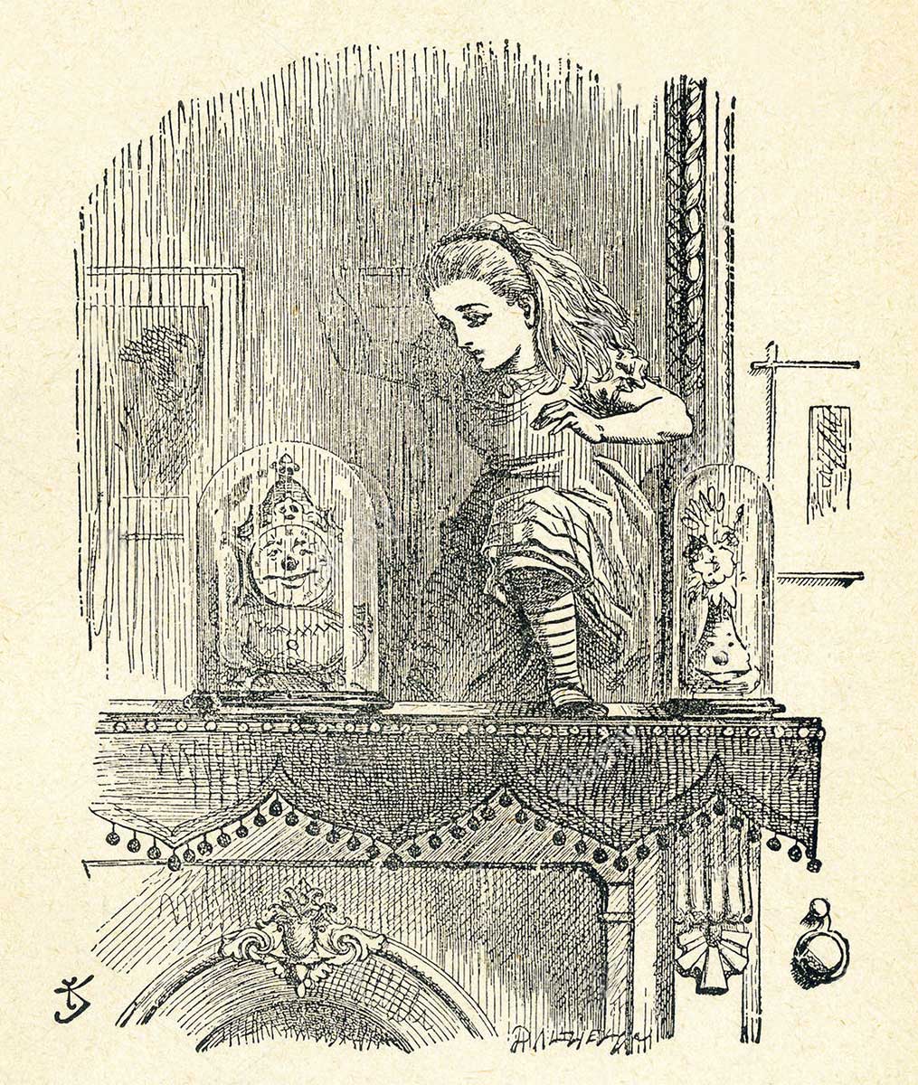 Illustraties uit Through The Looking Glass door John Tenniel. Tenniel maakte in totaal 92 houtgravures voor beide boeken.